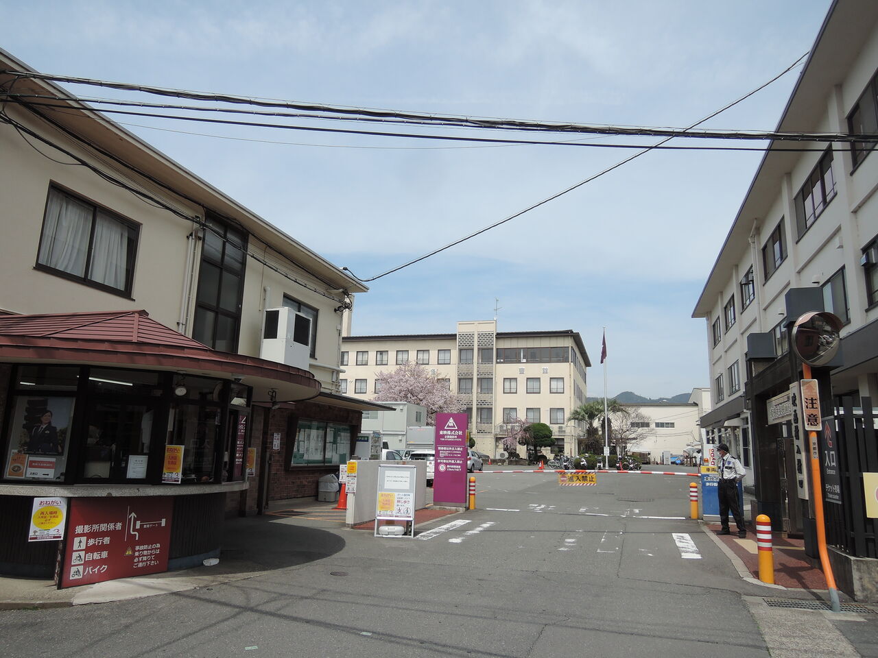 現在の東映京都撮影所。この風景は1973年当時とほとんど変わっていない。左側の建物が撮影所(本編)製作部のある建物。正面が俳優会館。右が厚生会館で「太秦映像」の製作部があった。スタジオエリアは右手奥にある。
